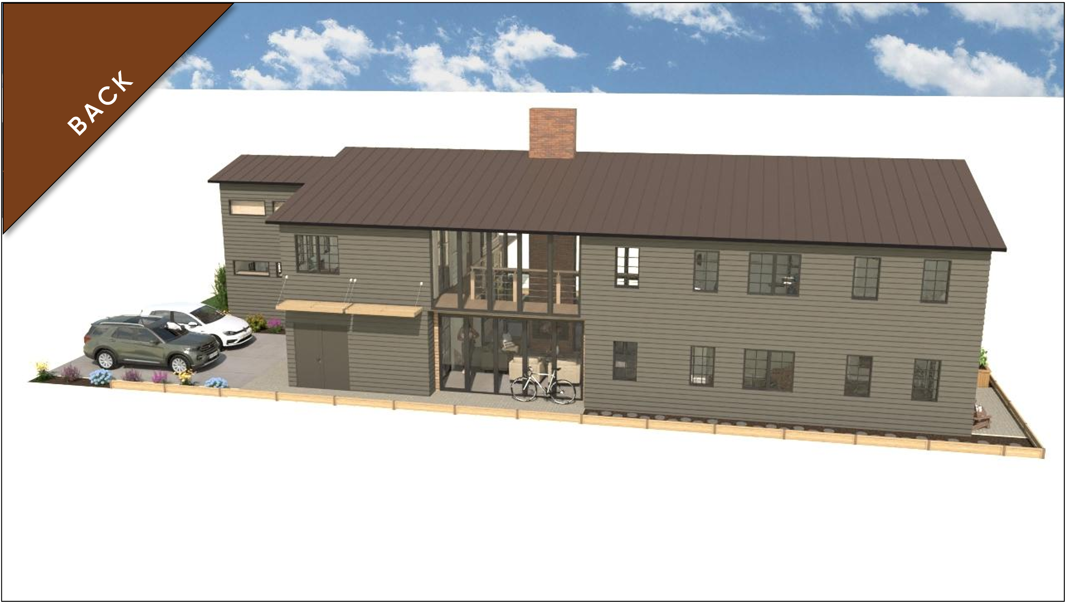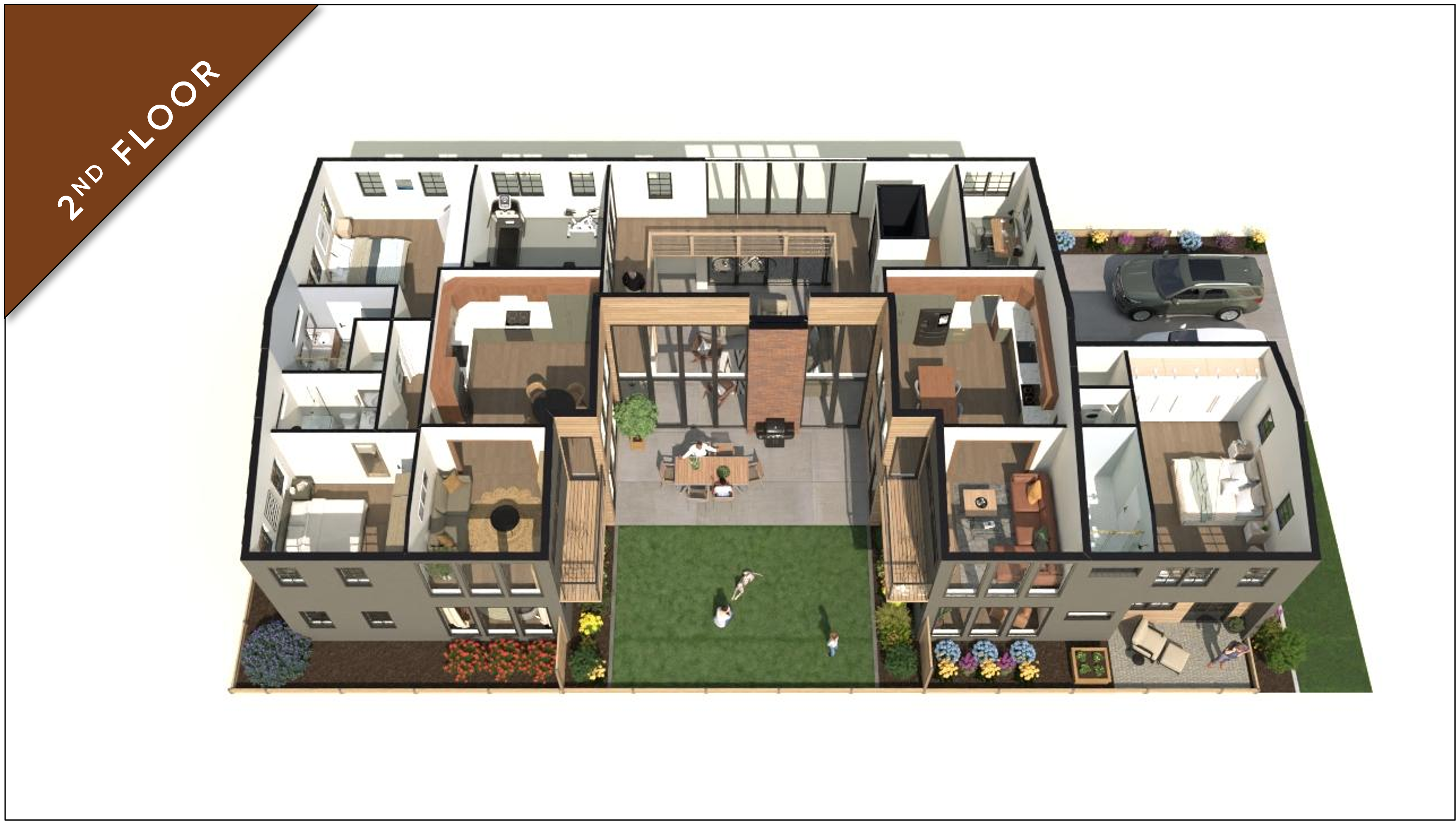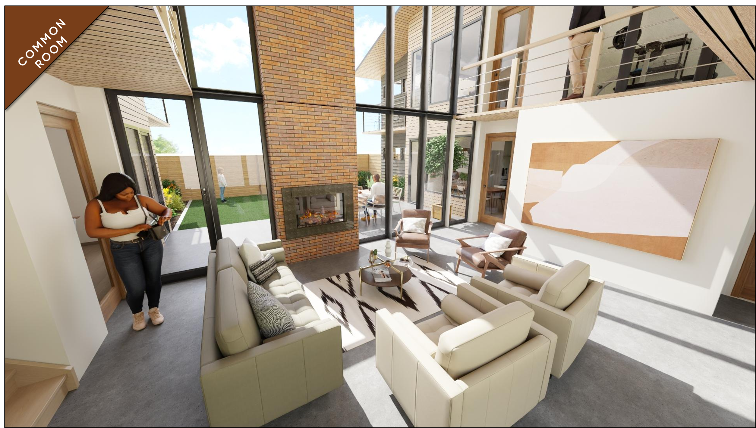 Gardenplex designs are not yet finalized, but the concepts below illustrate the concept of a four-unit building with shared amenities.