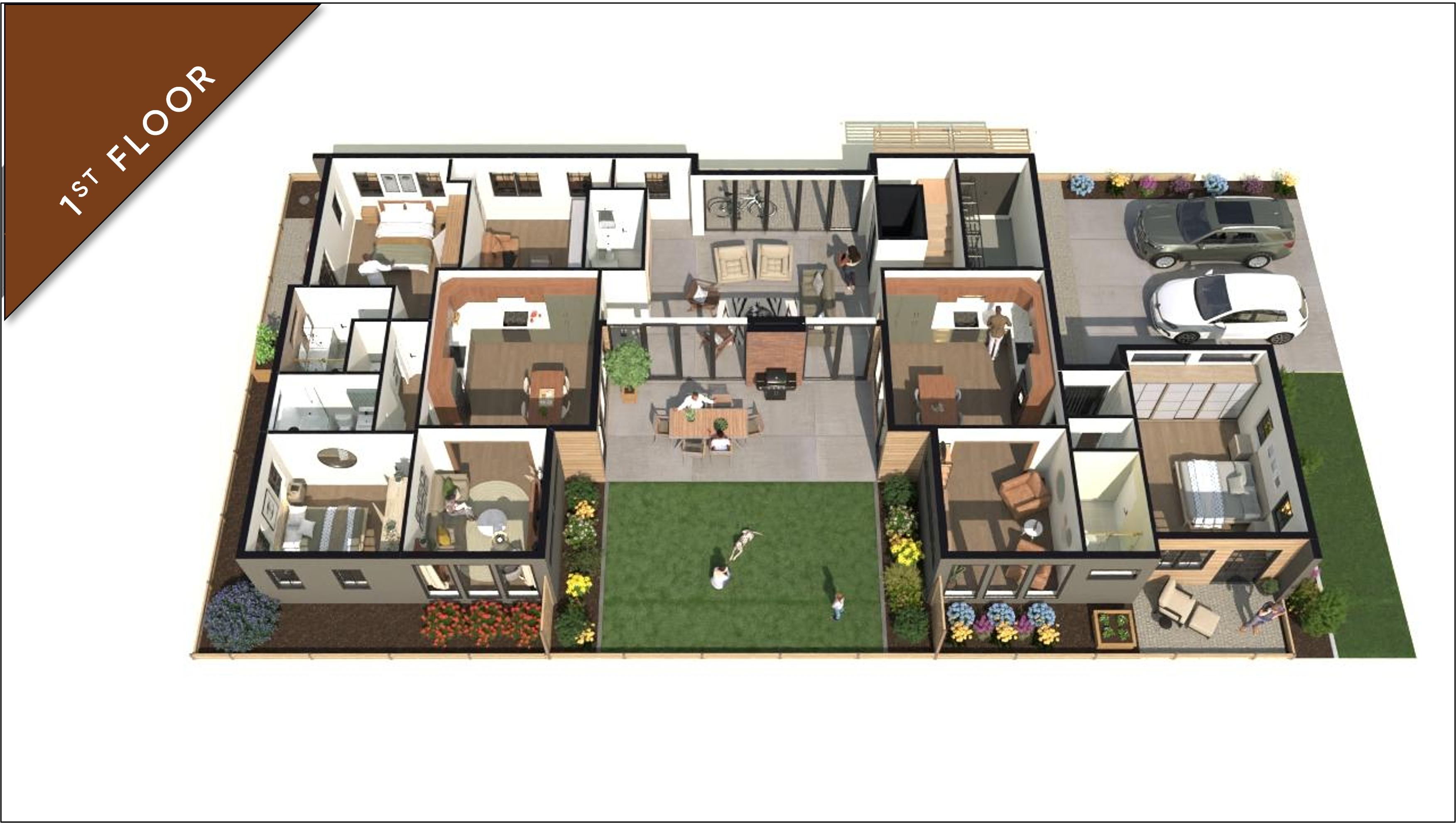 We want to bring comfort and well-being to people's lives by designing beautiful homes that foster social connection, use space in novel ways, and champion sustainability.With our fresh take on housing, we plug shared amenities and a courtyard into a four-unit building. The result combines the leisure of garden apartments with the scale of a quadruplex. We call it a Gardenplex, and we'd love for you to check it out.
